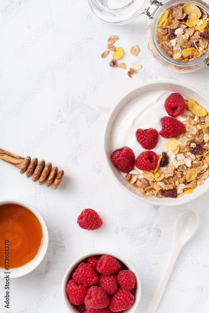 Greek yogurt in bowl with raspberries, honey and muesli on white table top view.