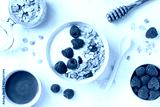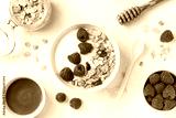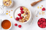 Greek yogurt in bowl with raspberries, honey and muesli on white stone table top view. Healthy diet breakfast.