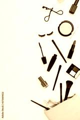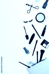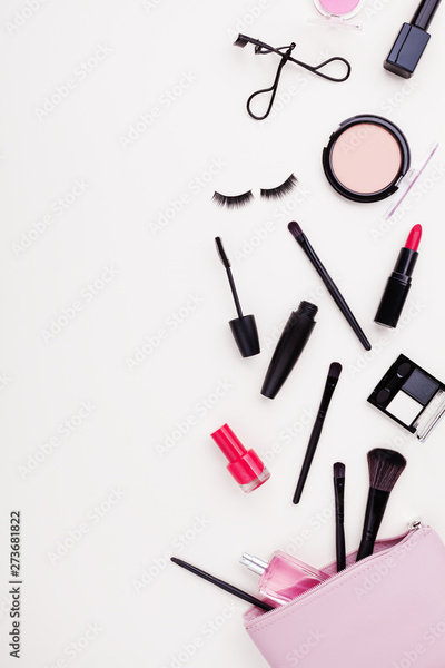 Woman makeup background with beauty products and cosmetics. Top view and flat lay style. .
