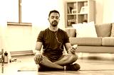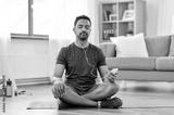 sport, technology and healthy lifestyle concept - indian man in earphones listening to music on smartphone at home