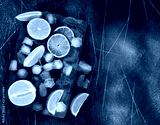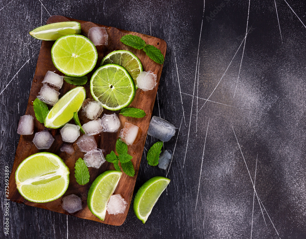 Fresh lime, mint and ice on cutting board. Ingredients for Mojito.