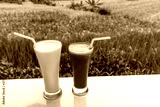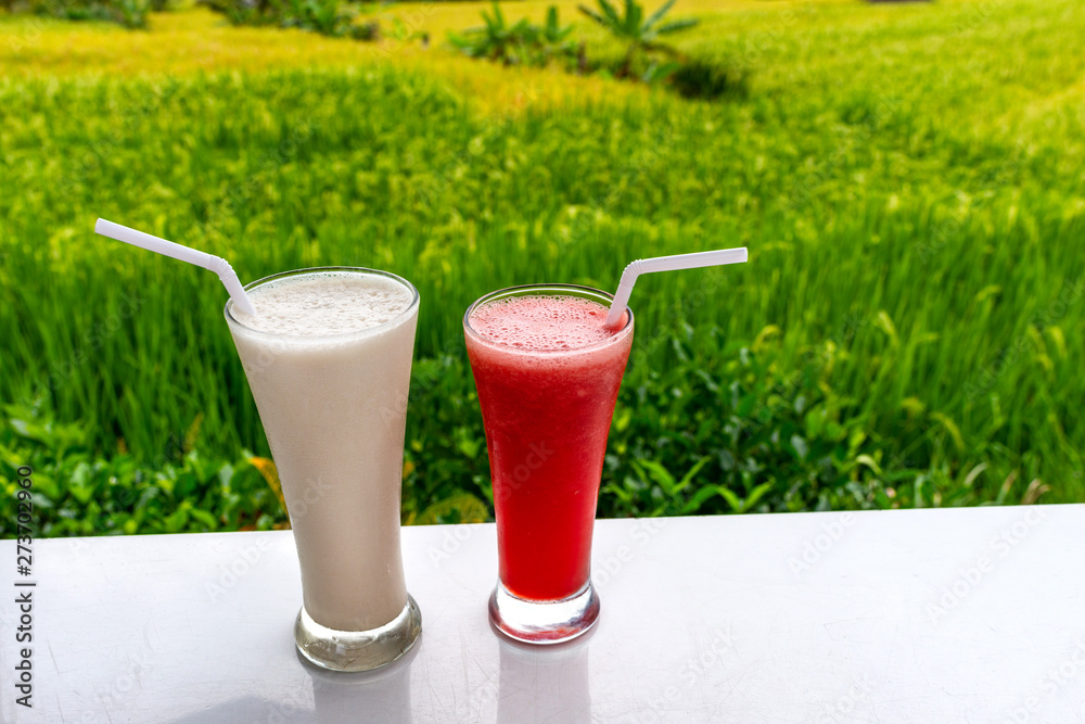 Cold and fresh Watermelon and milkshake smoothies on the rice terraces field background