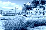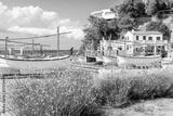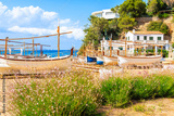 Traditional fishing boats on Sa Riera beach with flowers in foreground, Costa Brava, Spain