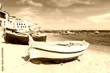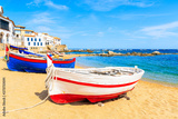 Traditional fishing boat on beach in Calella de Palafrugell, scenic village with white houses and sandy beach with clear blue water, Costa Brava, Catalonia, Spain