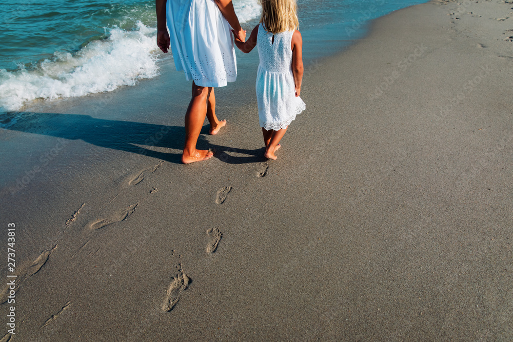 mother and daughter walking on beach leaving footprint in sand