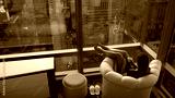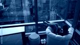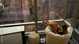 COPY SPACE: Unrecognizable woman sits in a leather chair and observes the city.