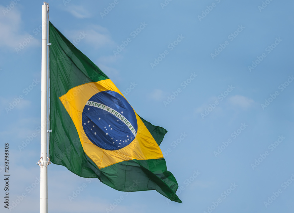 Brazil flag waving at the wind against blue sky