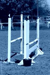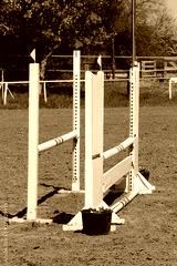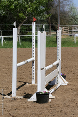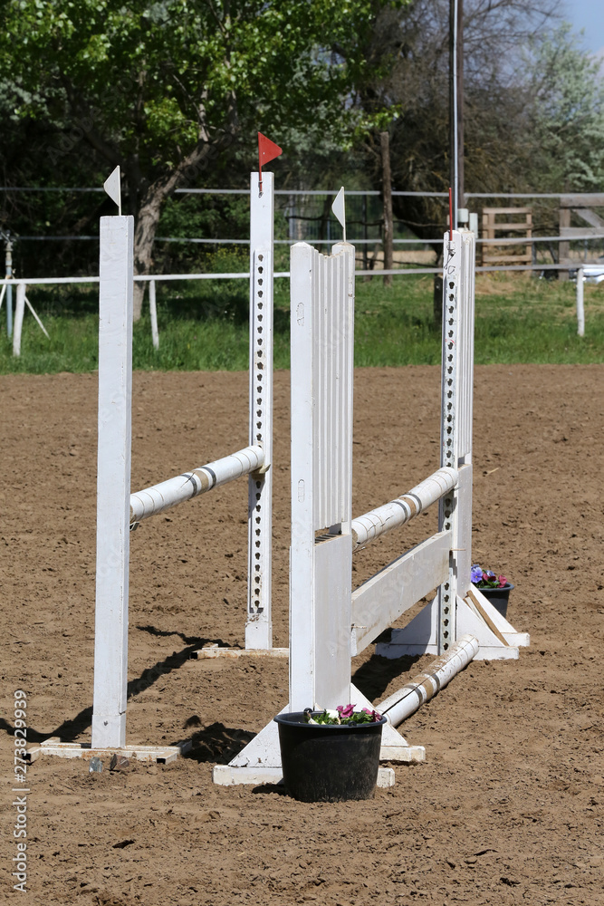 Outdoors photo of wooden barriers for jumping horses. Preparation of horses for performance on equestrian training