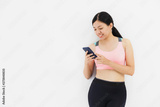Asian beautiful women using smartphone after play yoga and exercise on white wall background with copy space.Concept of people use technology to collect exercise data to improve physical health.