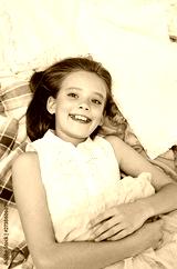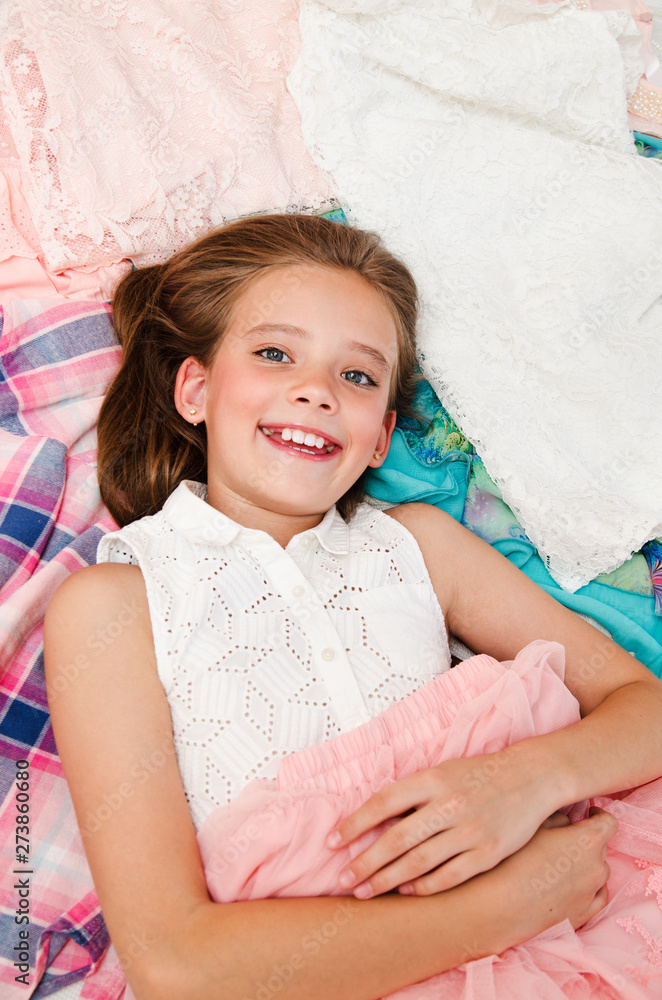 Portrait of smiling happy little girl child schoolgirl lying on her clothes choosing dresses