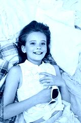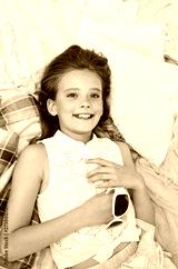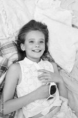 Portrait of smiling happy little girl child schoolgirl lying on her clothes choosing dresses