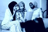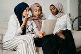 Three millennials women use a tablet on the sofa in the house - Arab friends surf the internet with the device
