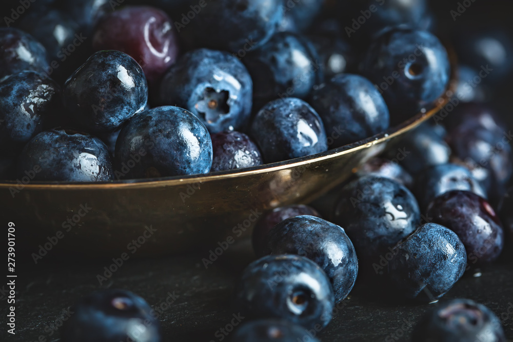 Juicy and fresh blueberries with green leaves on rustic table. Blueberry antioxidant. Concept for healthy eating and nutrition. Selective focus.