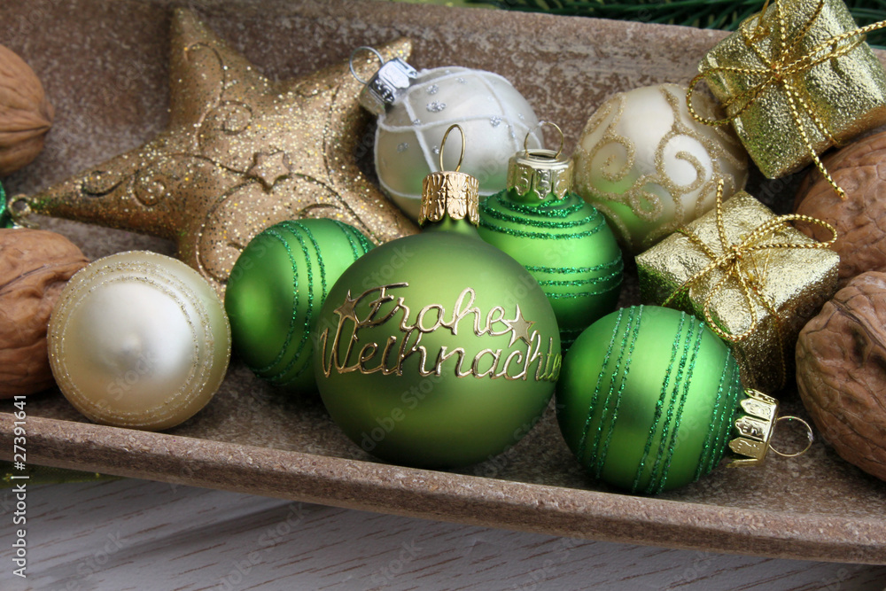 Weihnachtskugel mit der Inschrift Frohe Weihnachten