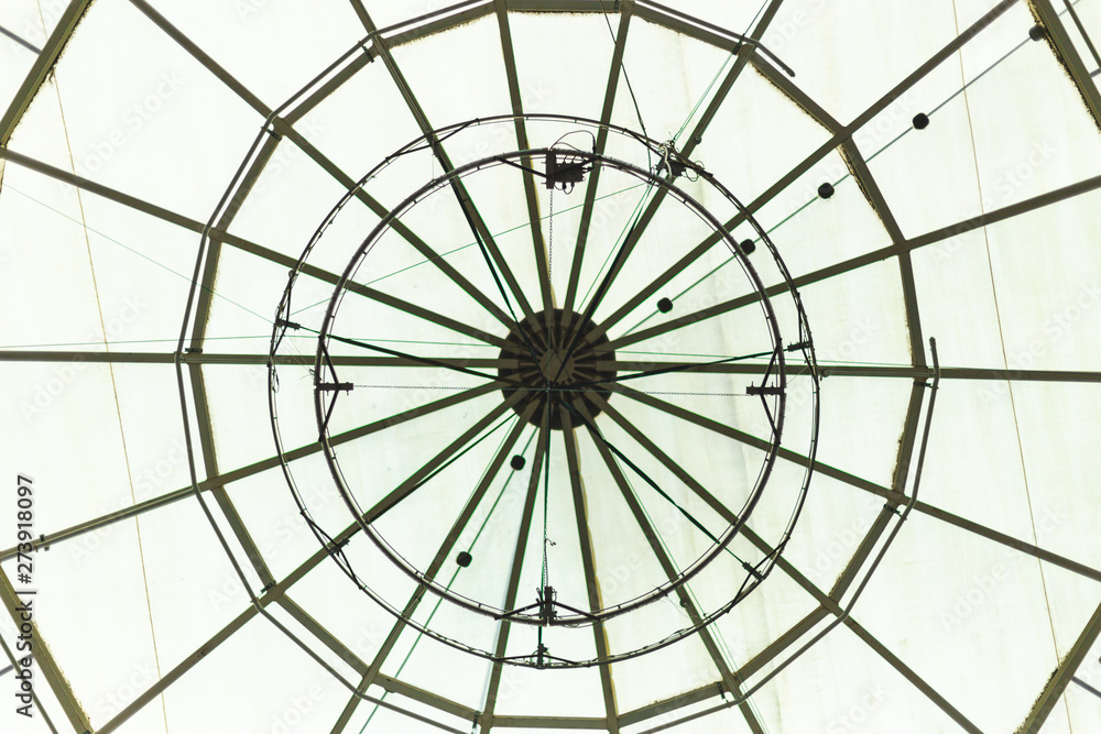 Round glass roof of a building interior – Circular window from a construction interior used for ventilation – Beautiful decorative dome of s gallery or mall-