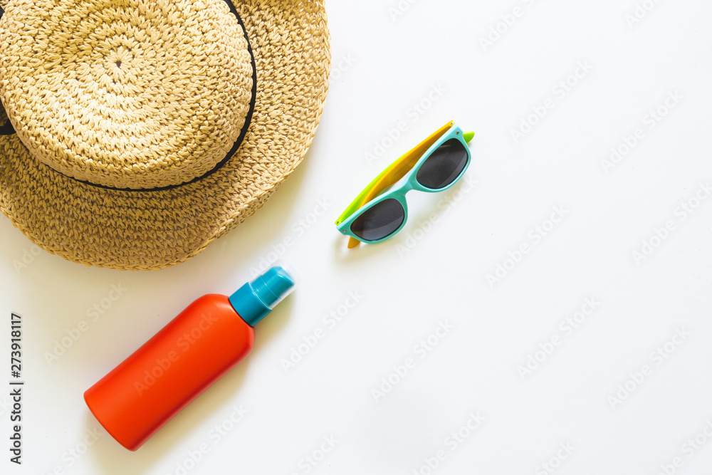 Close-up of yellow straw hat, sun lotion and black sunglasses on a white background – Summer accessories to take away on a holyday with copy space