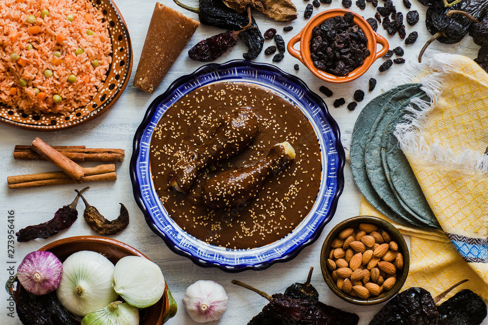Mole Mexicano, Poblano mole ingredients, mexican spicy food traditional in Mexico