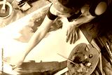 Finger painting hobby. Top view of female artist sitting on floor, using blue and yellow colors to create abstract artwork.