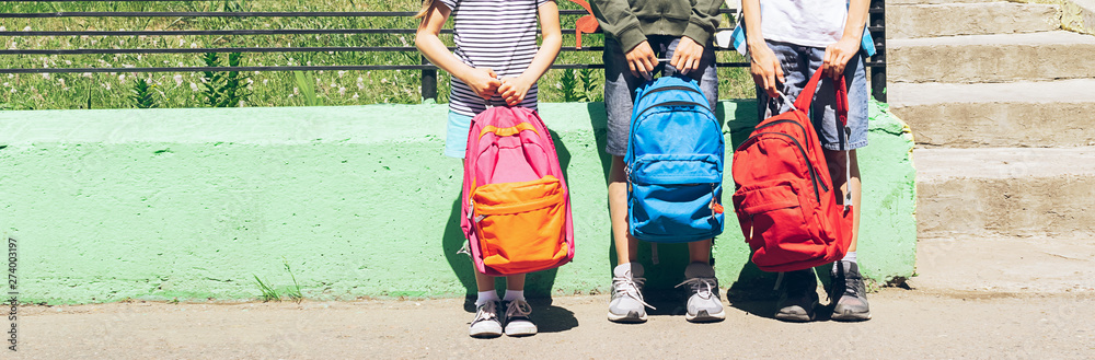 Children of different ages, boys and girls are holding bright backpacks. School concept. Horizontal frame. Copy space