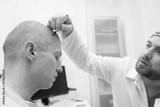 Baldness treatment. Patient suffering from hair loss in consultation with a doctor. Preparation for hair transplant surgery. The line marking the growth of hair. The patient controls the marking in