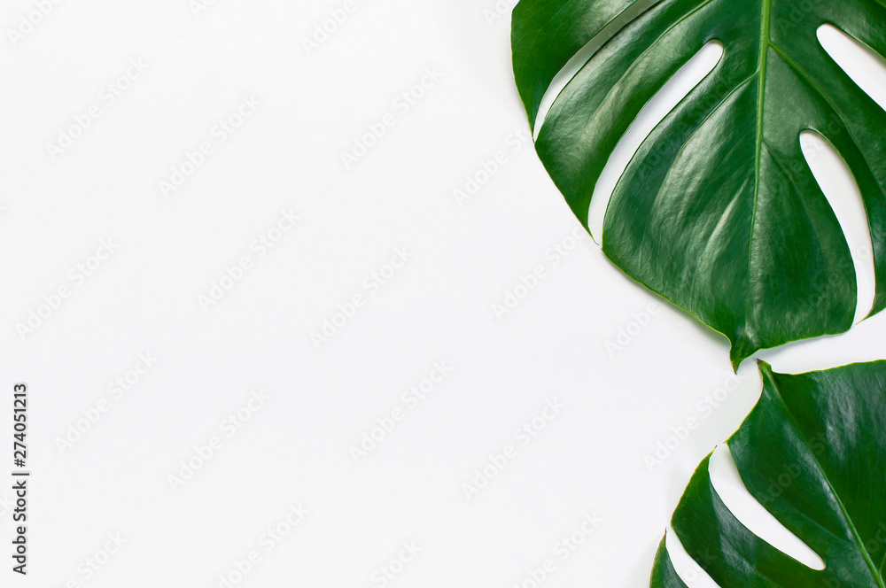 Monstera leaves on light gray background. Flat lay, top view, copy space. Summer background, nature. Creative minimal background with tropical leaves. Leaf pattern