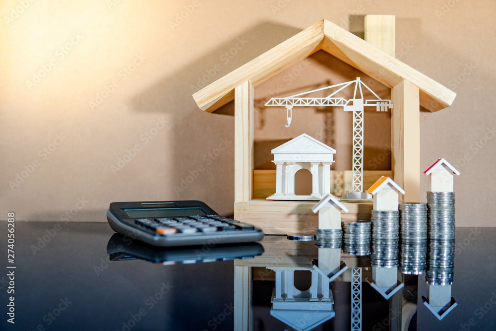Banking concept. Loan interest rate calculation. Saving money for property investment or real estate development. Home mortgage and lease. Coin stacked, house and bank models with calculator on table.