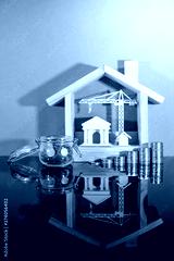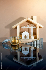 Banking concept. Loan interest rate growth. Saving money for property or real estate investment. Home mortgage and lease. Coin jar and stacked with bank, house and construction crane models on table.