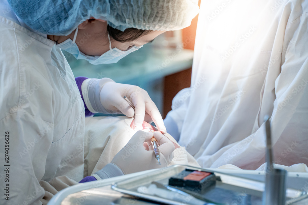 Female Asian dentist using instruments for examining and curing patient teeth in dental clinic. Dental procedure and medical treatment.