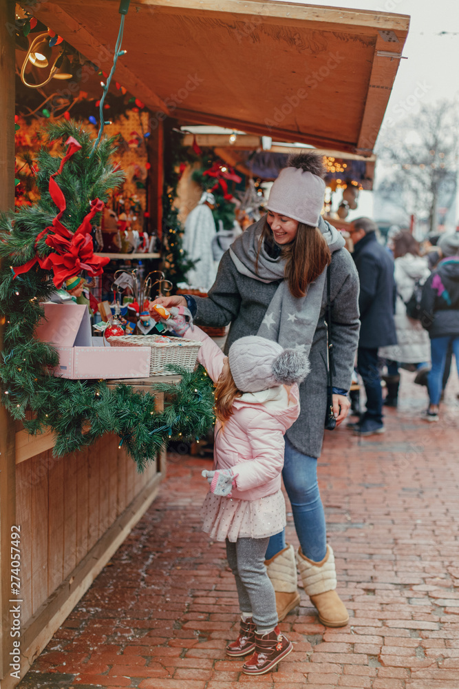 Mother with child girl choosing buying gifts at Christmas market and celebrating New Year holiday. Family outdoor winter activity. Mom and daughter spend time together. Authentic lifestyle.