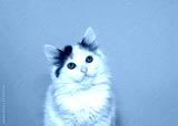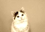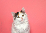 Portrait of small white kitten with brown and gray facial markings and very large eyes looking at viewer curiously. Pink background with copy space.