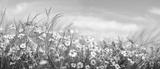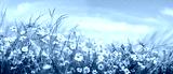 Beautiful field meadow flowers chamomile, blue wild peas in morning against blue sky with clouds, nature landscape, close-up macro. Wide format, copy space. Delightful pastoral airy artistic image.