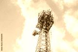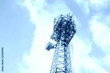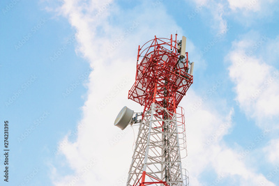 Wireless Communication Antenna Transmitter. Telecommunication tower with antennas on blue sky background.