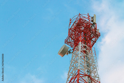 Wireless Communication Antenna Transmitter. Telecommunication tower with antennas on blue sky background.