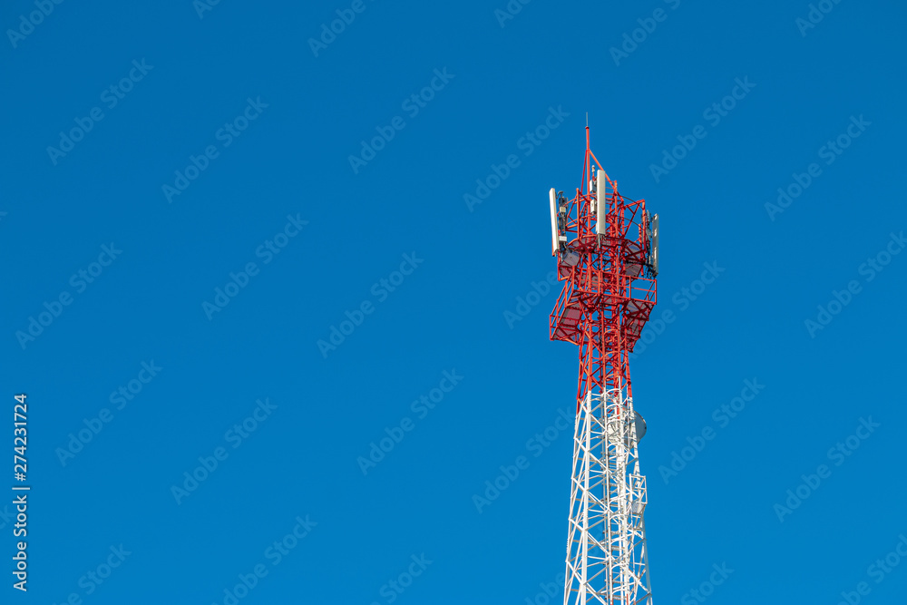 Wireless Communication Antenna Transmitter. Telecommunication tower with antennas on blue sky background.