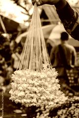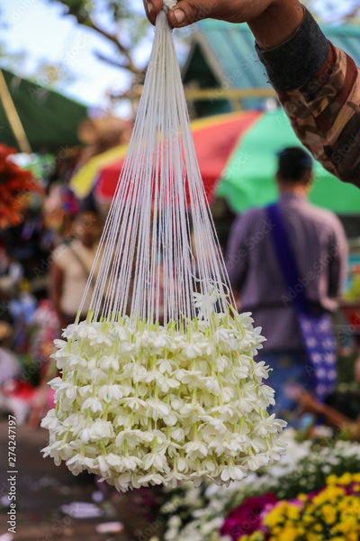 People walking along the street selling garland of fresh flowers, Hongsa(Bago), Myanmar.