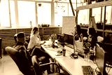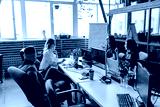 Young team works in a spacious light modern open space office sitting at a desks with a computer and laptops