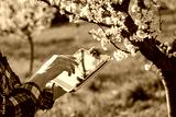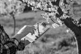 Farmer using digital tablet while examining blooming fruit tree in orchard
