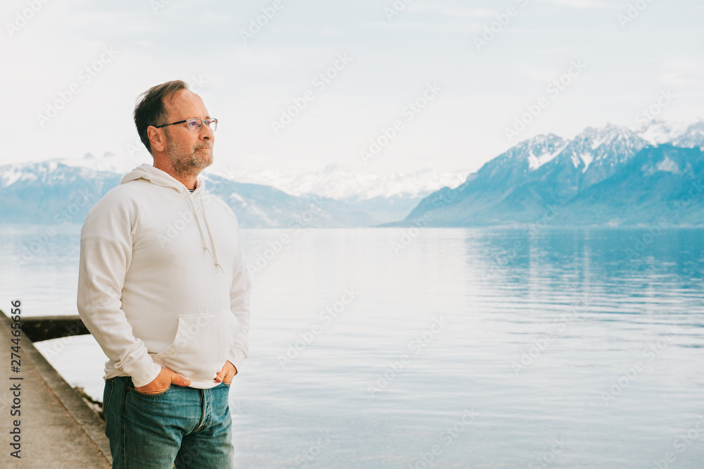 Portrait of handsome man admiring beautiful lake with mountains, wearing white sweatshirt