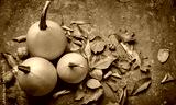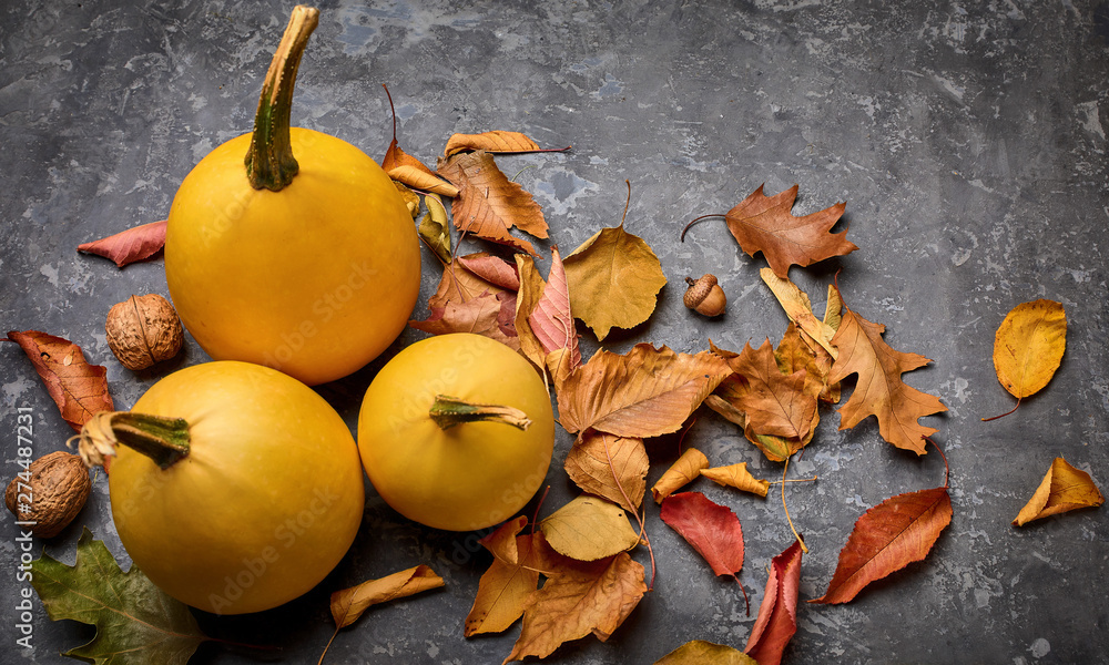 Autumn still life pumpkin with yellow leaves on gray concrete surface top view.