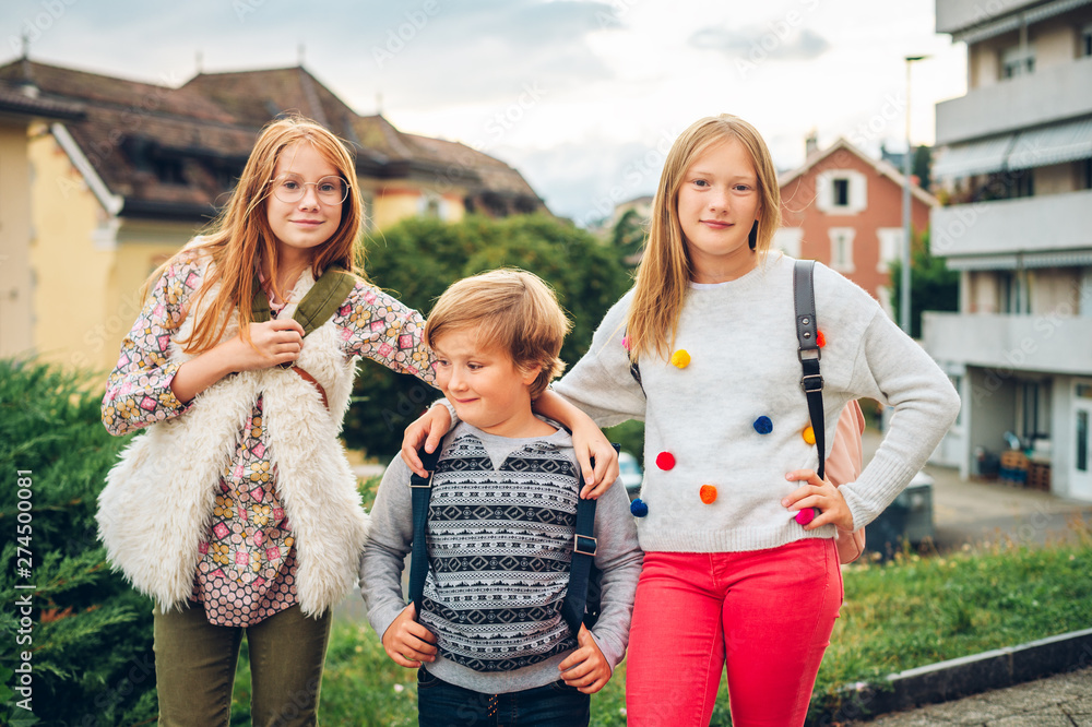 Group of 3 funny kids with backpacks, 2 schoolgirls and one preschooler, back to school concept