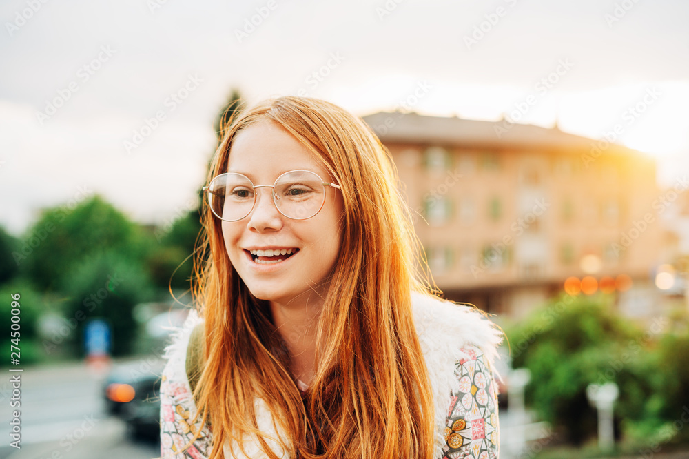 Outdoor portrait of adorable 10-12 year old girl wearing backpack