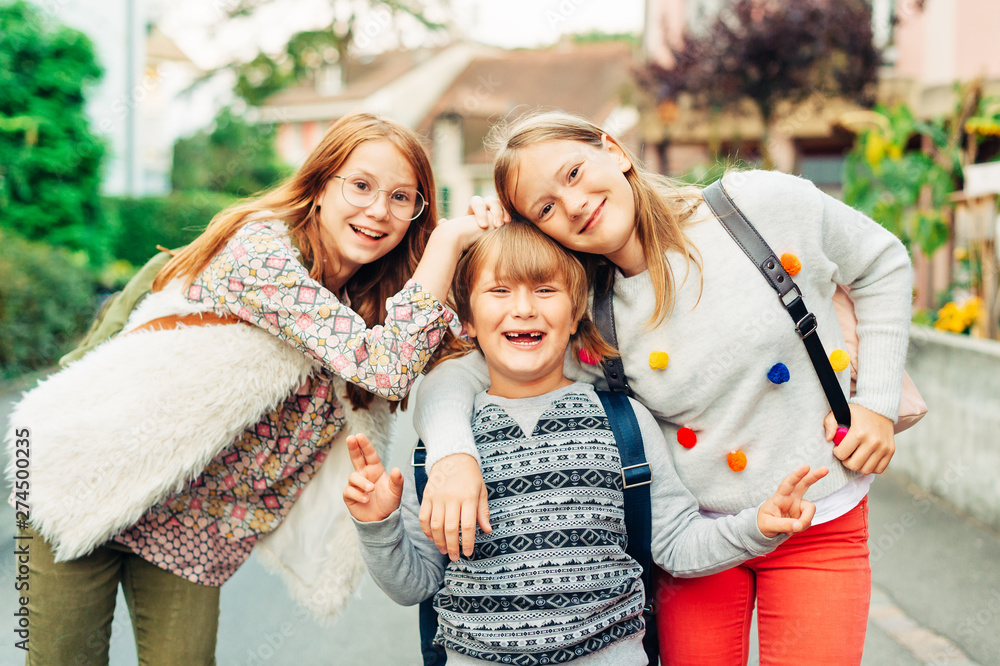 Group of 3 funny kids with backpacks, 2 schoolgirls and one preschooler, back to school concept
