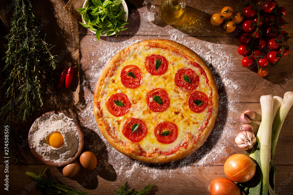 Pizza margherita cheese on wood background. Top view, close up. Traditional Brazilian Pizza