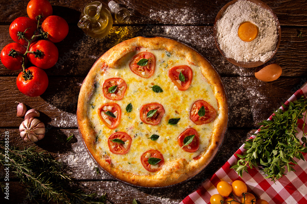Pizza Margherita on wood background, top view. Pizza Margarita with Tomatoes, Basil and Mozzarella Cheese close up. Traditional Brazilian Pizza.