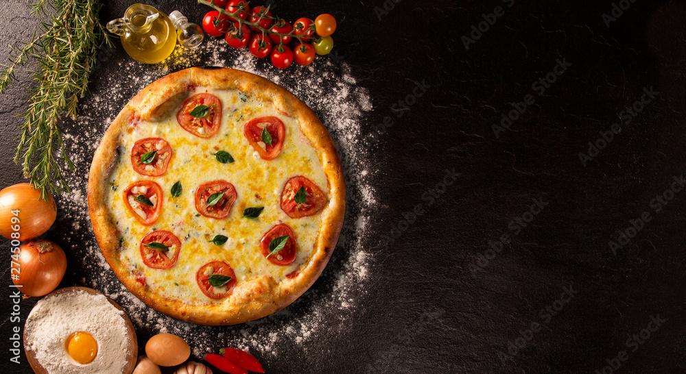 Pizza Margherita on black stone background, top view. Pizza Margarita with Tomatoes, Basil and Mozzarella Cheese close up. Traditional Brazilian Pizza.