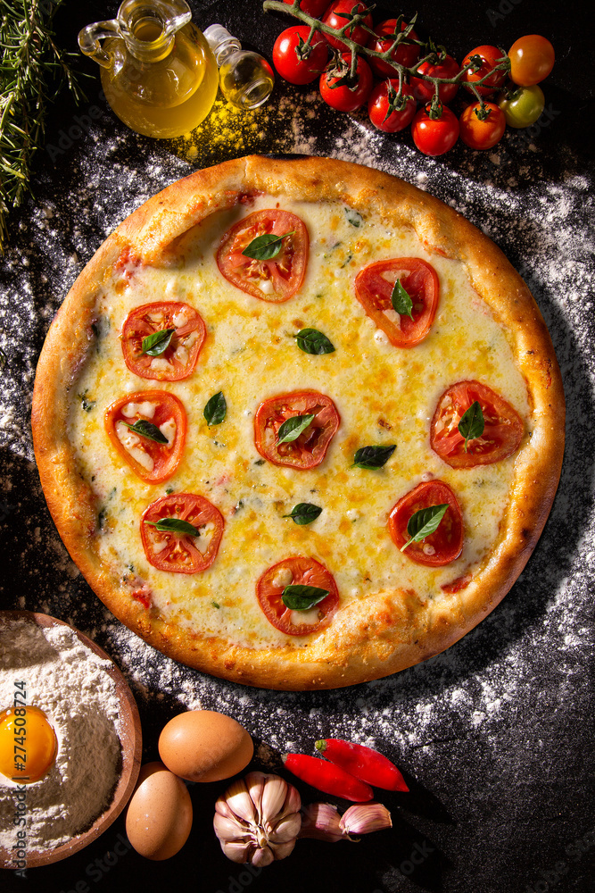 Pizza Margherita on black stone background, top view. Pizza Margarita with Tomatoes, Basil and Mozzarella Cheese close up. Traditional Brazilian Pizza.