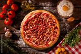 Pizza pepperoni on wood background. Top view, close up. Traditional Brazilian Pizza