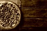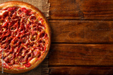 Pizza pepperoni on wood background. Top view, close up. Traditional Brazilian Pizza