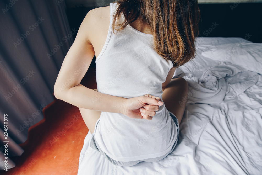 Close-up from back view of young woman suffering from Backache or Sore waist after her wake up in the bedroom. Conceptual of woman stretching suffering from sudden back pain.