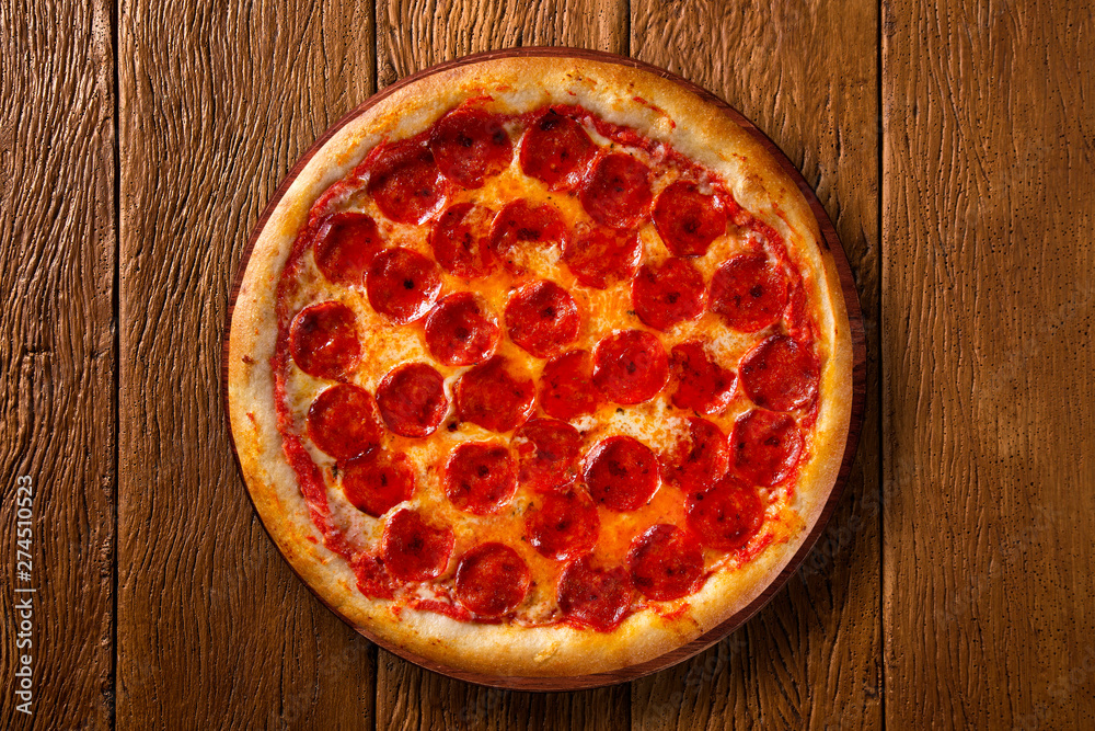 Pizza pepperoni on wood background. Top view, close up. Traditional Brazilian Pizza
